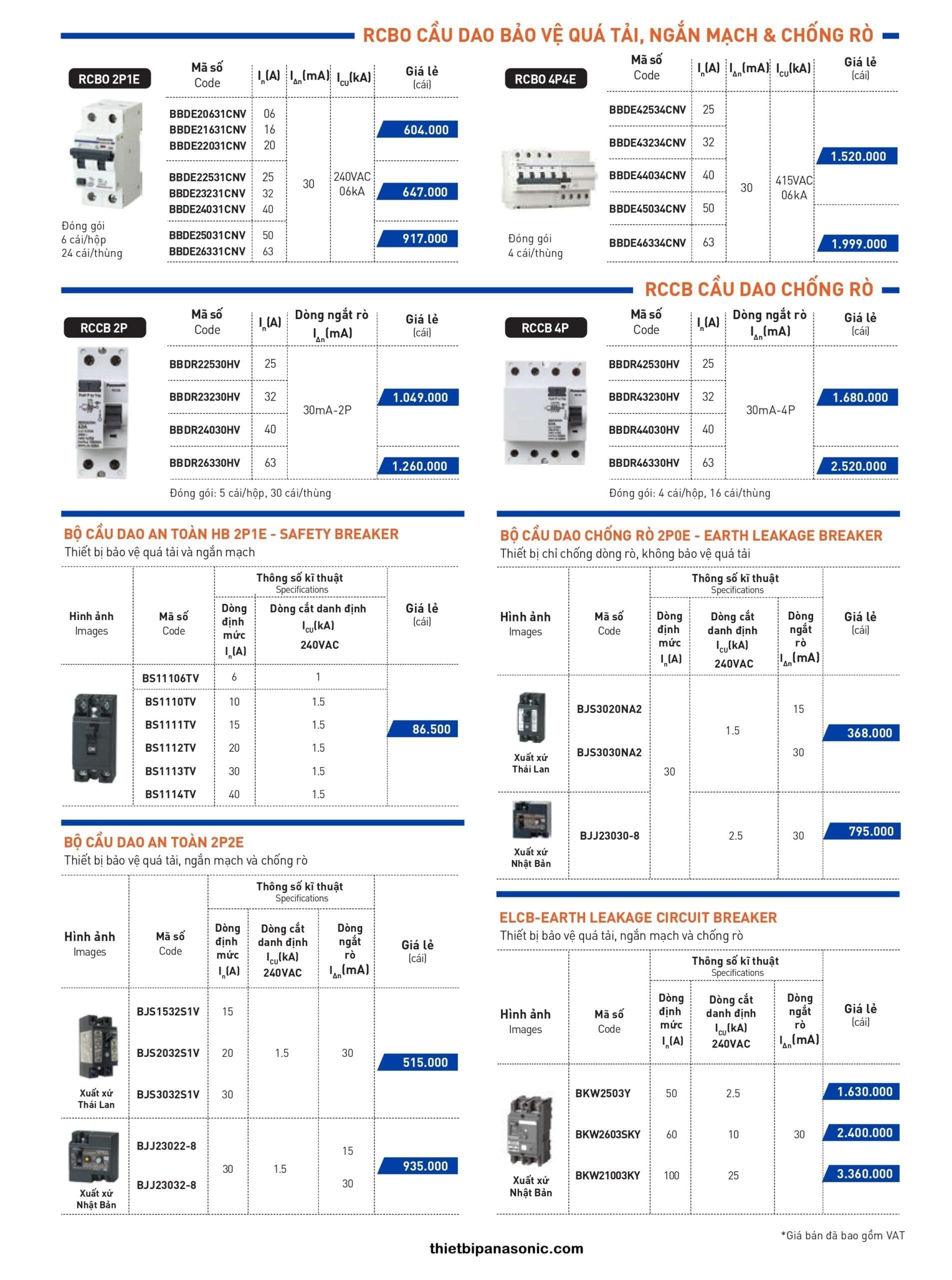 Bảng giá CB Chống giật (RCBO, RCCB, ELB, ELCB, CB Cóc chống giật)