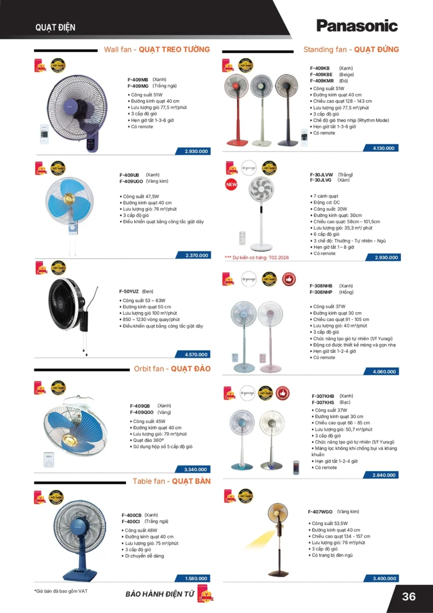 5. Quạt điện (quạt đứng Panasonic, quạt treo tường Panasonic, quạt đảo trần Panasonic, quạt tích điện Panasonic)  Trang 38-41