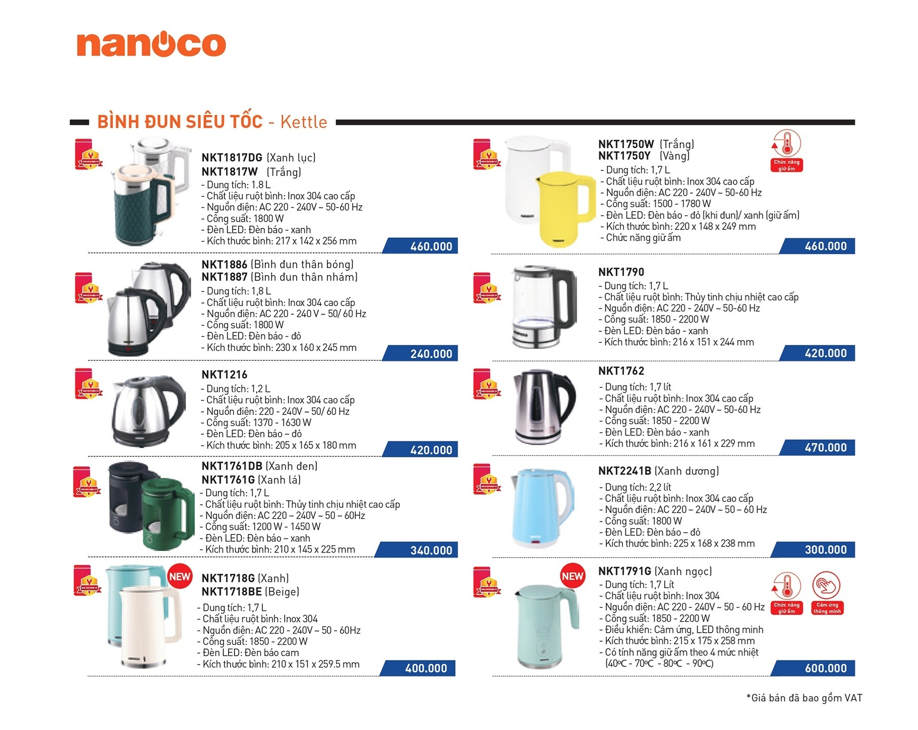 Catalogue Bảng giá bình đun nước siêu tốc Nanoco
