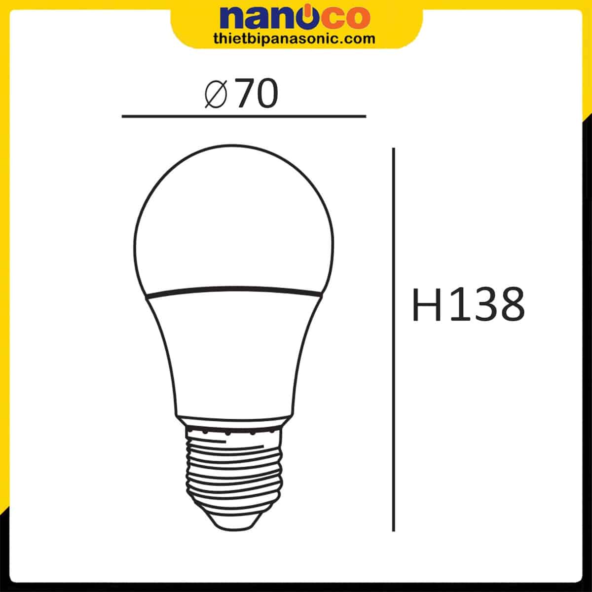 Về kích thước, Bóng đèn LED tròn 12W Nanoco có đường kính 70mm và chiều cao 138mm, mang đến một hình dáng tròn và nhỏ gọn. Đèn được thiết kế với chất liệu nhôm bọc nhựa PBT cho thân đèn và chóa đèn nhựa PC trắng sữa, tạo nên sự bền bỉ và thẩm mỹ cho sản phẩm.