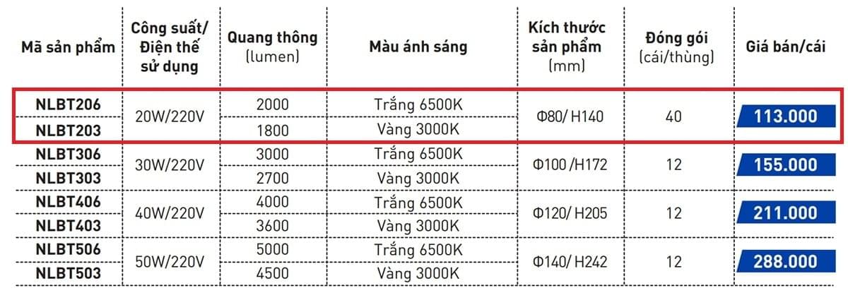 | NLBT206 | 20W | 2000lm | Trắng 6500K |