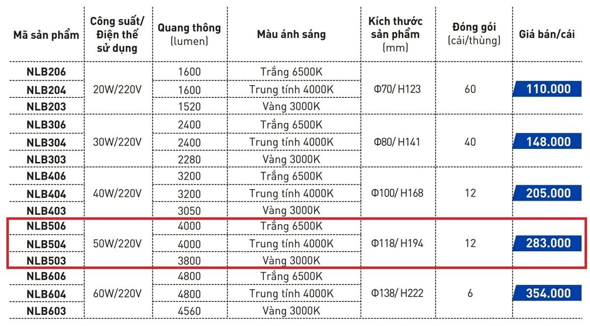 | NLB506 | 50W | 4000lm | Trắng 6500K |