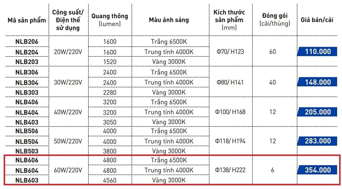 | NLB606 | 60W | 4800lm | Trắng 6500K |