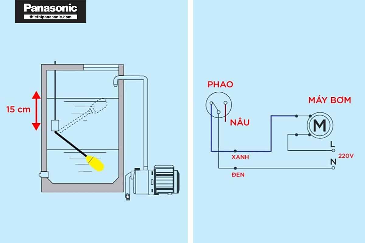 2 dây điện sử dụng cho phao sẽ đi qua cầu dao bảo vệ được lắp ở vị trí dễ vận hành nhất, từ cầu dao điện sẽ đi lên hộp tiếp điểm rồi đi xuống máy bơm nước. Lưu ý: cần đi dây điện cho máy bơm để phao có thể hoạt động tốt trong bồn đựng nước inox cũng như bồn chứa bằng nhựa.