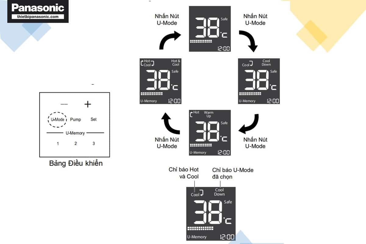 - Sau đó có thể thay đổi chức năng U-Mode bằng cách nhấn nút U-Mode (U-Mode Cool Down -> U-Mode Warm Up -> U-Mode Hot & Cool)