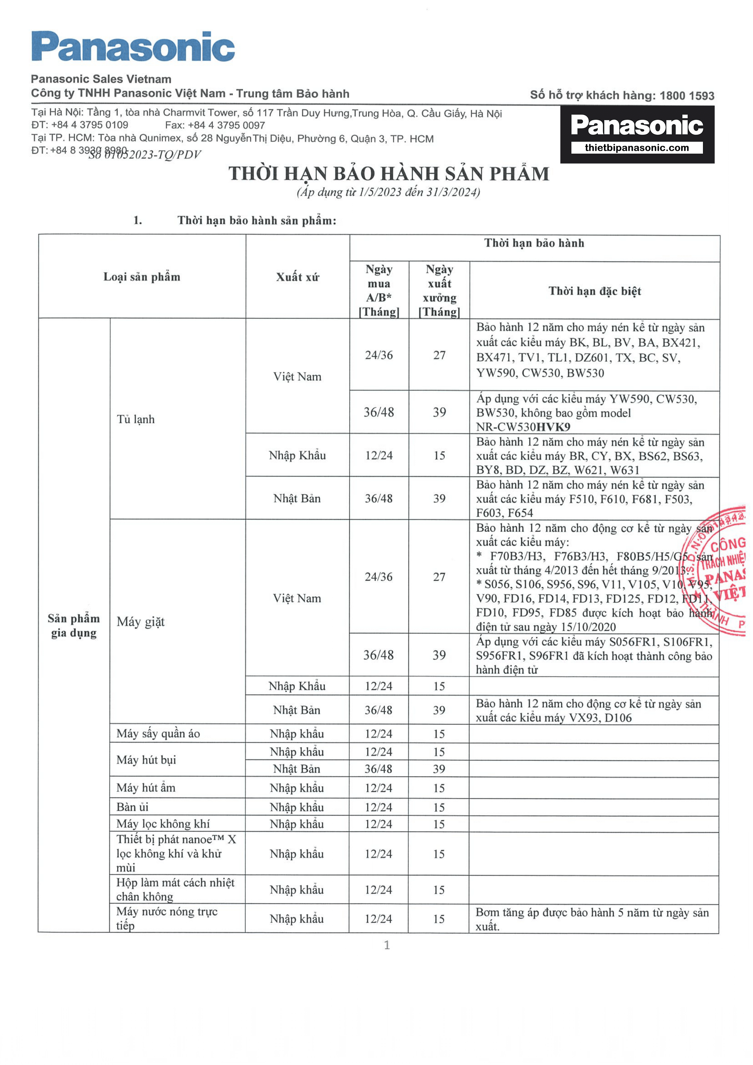 Chính sách bảo hành Panasonic năm 2023-2024 (Trang 1/6)