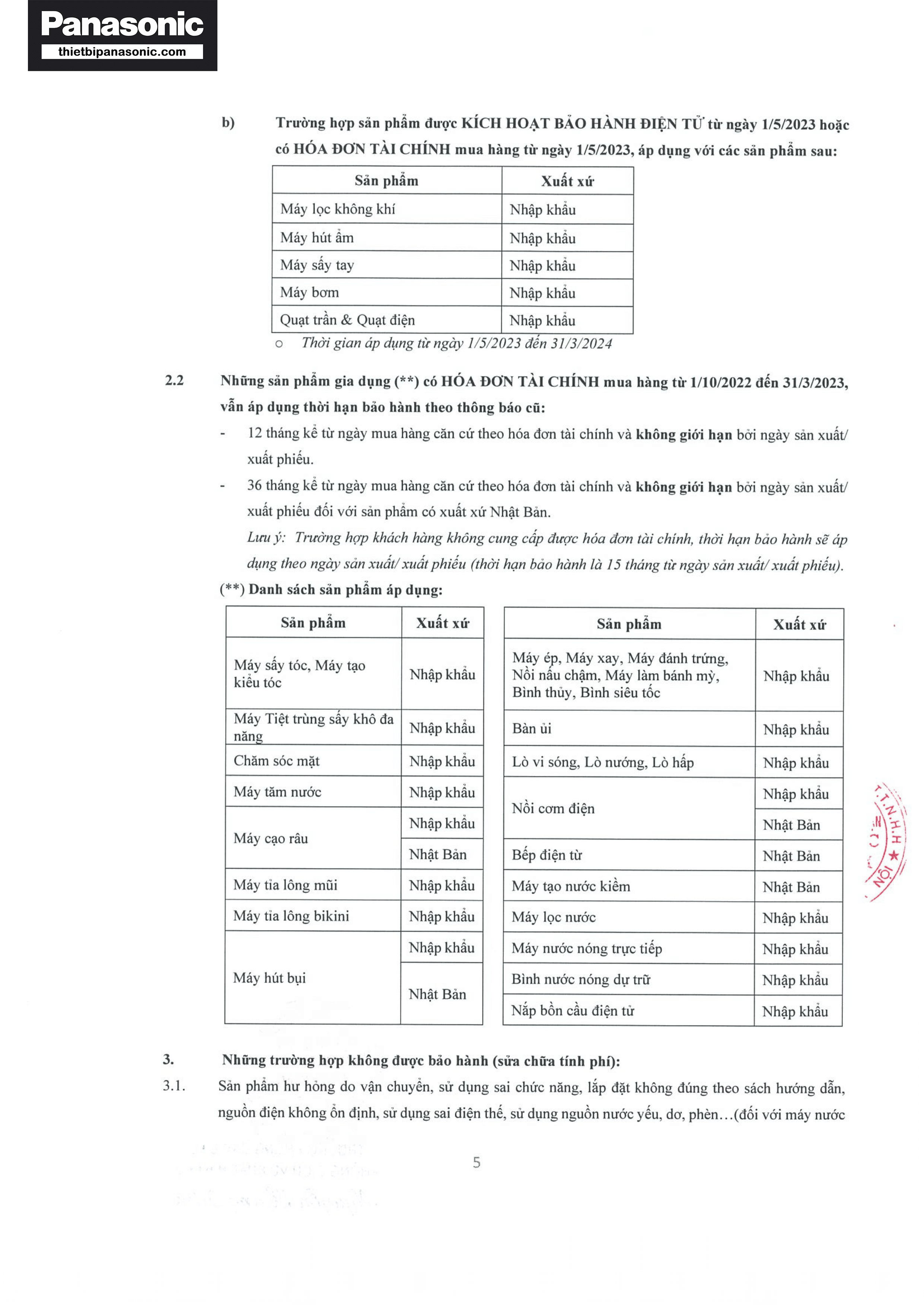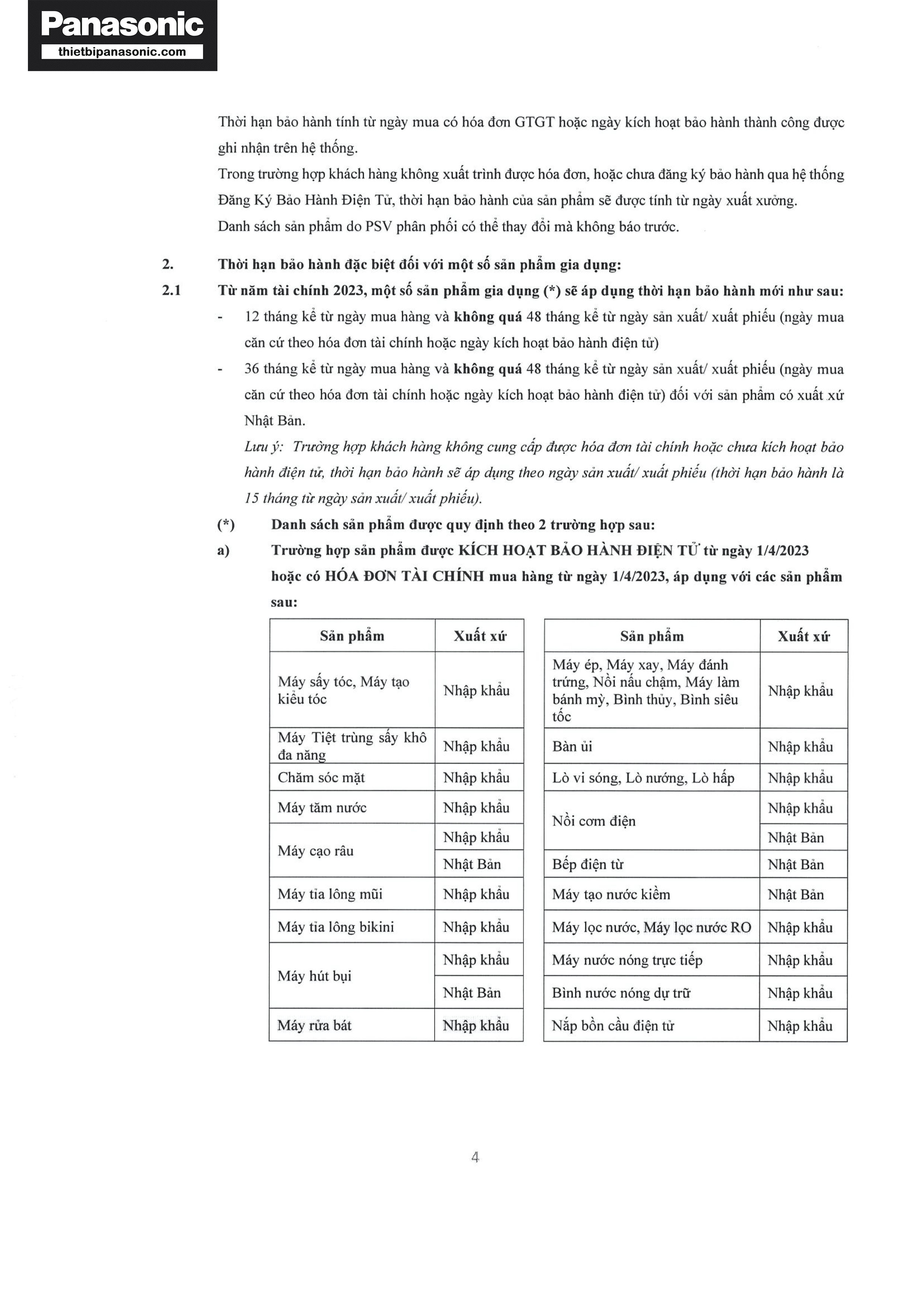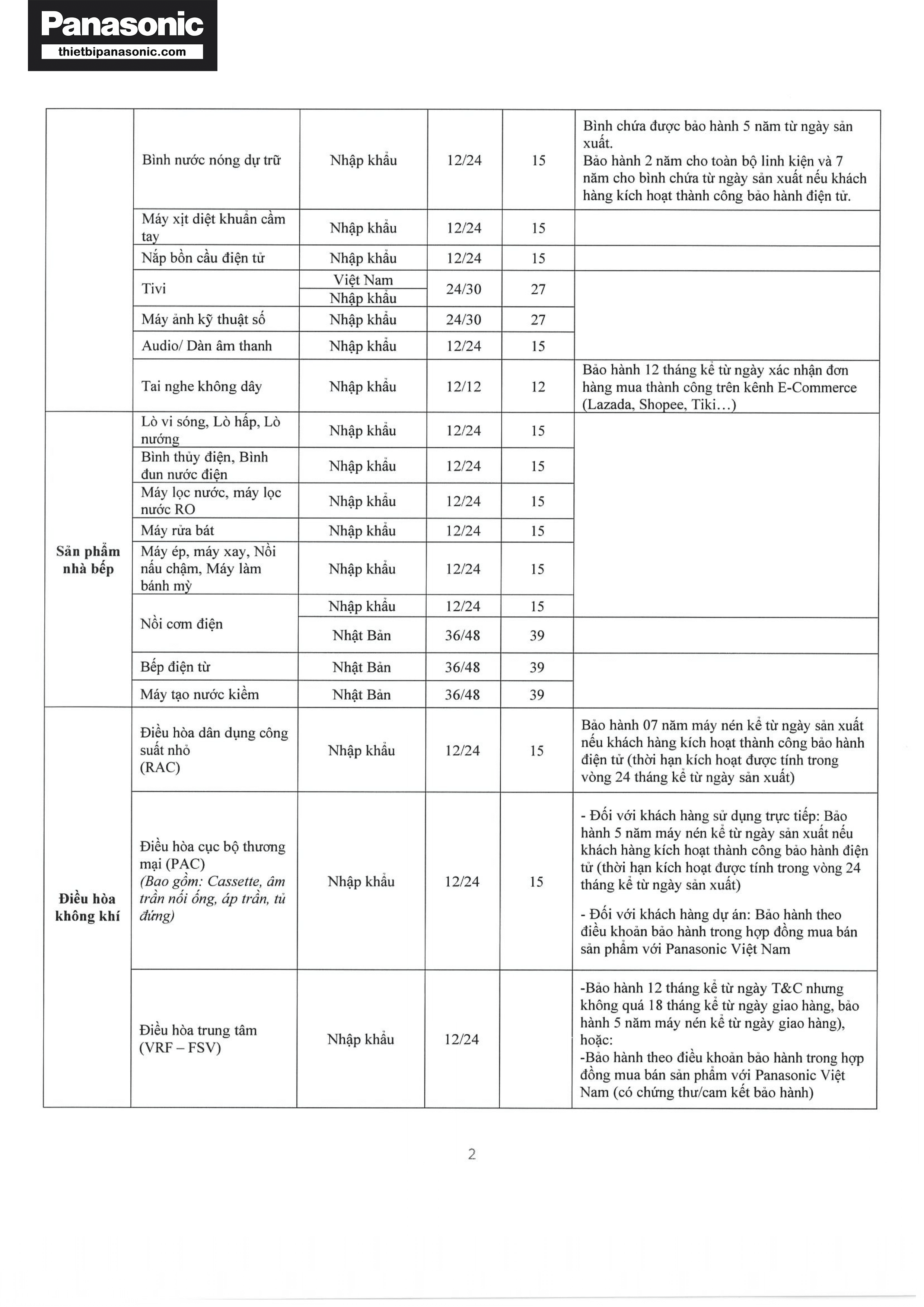 Chính sách bảo hành Panasonic năm 2023-2024 (Trang 2/6)