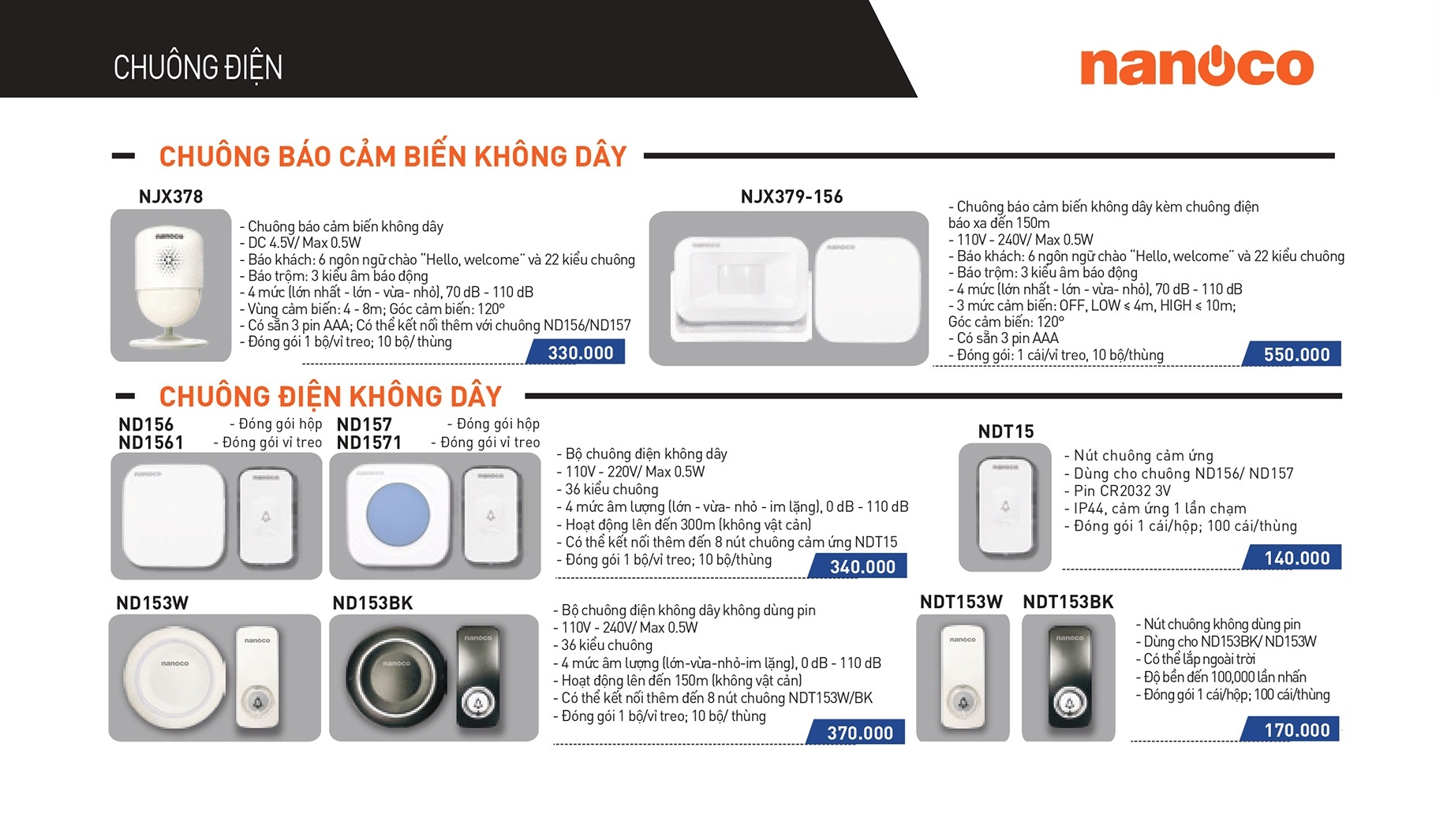 Catalogue Bảng giá chuông điện chuông cửa Nanoco