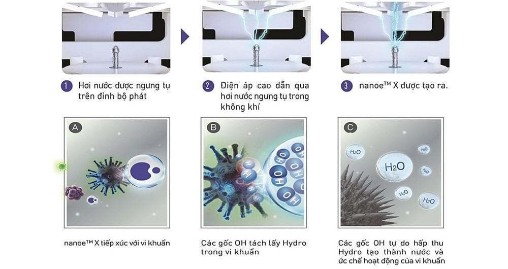 - Bước 3: các máy lạnh sẽ sản sinh ra Nanoe X chứa hàng tỷ gốc OH-