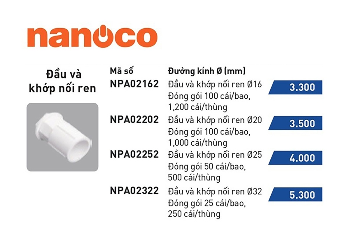 Đèn gương Panasonic, Bếp điện từ Nanoco, Bếp hồng ngoại Nanoco, Bình đun siêu tốc Nanoco, Bình thủy điện Nanoco, Bóng đèn LED Filament Panasonic, Co nối Nanoco, Đầu giảm Nanoco, Đầu nối ống mềm Nanoco, Đầu và khớp nối ren Nanoco, Dây cáp đồng trục Nanoco, Dây cáp mạng CAT5e Nanoco, Dây cáp mạng CAT6 Nanoco, Dây điện thoại và báo cháy Nanoco, Đèn bắt muỗi Nanoco, Đèn gắn tường Nanoco, Đèn LED bán nguyệt Nanoco, Đèn LED dây Nanoco, Đèn LED dây Panasonic, Đèn LED khẩn cấp Nanoco, Đèn LED Linear, Đèn LED Panel Nanoco, Đèn Pin đội đầu Nanoco, Đèn thoát hiểm Exit Nanoco, Đèn tuýp LED Nanoco, Hộp âm Hộp nổi Nanoco, Hộp nối 1 ngã Nanoco, Hộp nối 2 ngã Nanoco, Hộp nối 3 ngã Nanoco, Hộp nối 4 ngã Nanoco, Hộp nối dây Nanoco, Kẹp đỡ ống luồn dây điện chữ C Nanoco, Kẹp ống Omega Nanoco, Khớp nối trơn PVC Nanoco, Lò xo uốn ống Nanoco, Mặt thiết bị Nanoco, Máy hút ẩm Nanoco, Máy sưởi dầu Nanoco, Nắp đậy hộp nối tròn Nanoco, Nẹp luồn dây điện vuông Nanoco, Nồi chảo Nanoco, Ổ cắm Phích cắm đơn Nanoco, Ống luồn dây điện tròn Nanoco, Ống ruột gà HDPE Nanoco, Ống ruột gà luồn dây điện xoắn PVC Nanoco, Phụ kiện dùng cho HB Nanoco, Quạt hút sưởi Nanoco, T nối ống luồn dây điện điện Nanoco, Tủ sấy quần áo Nanoco