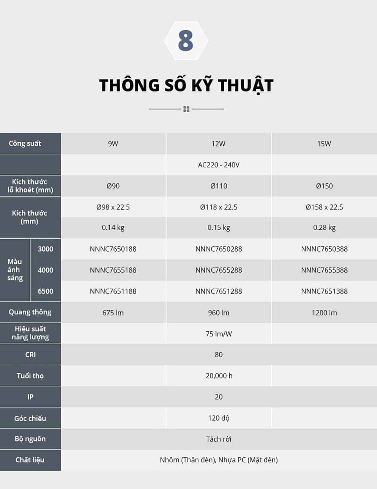 | Mã sản phẩm | Công suất | Màu ánh sáng | Quang thông | Lỗ khoét |