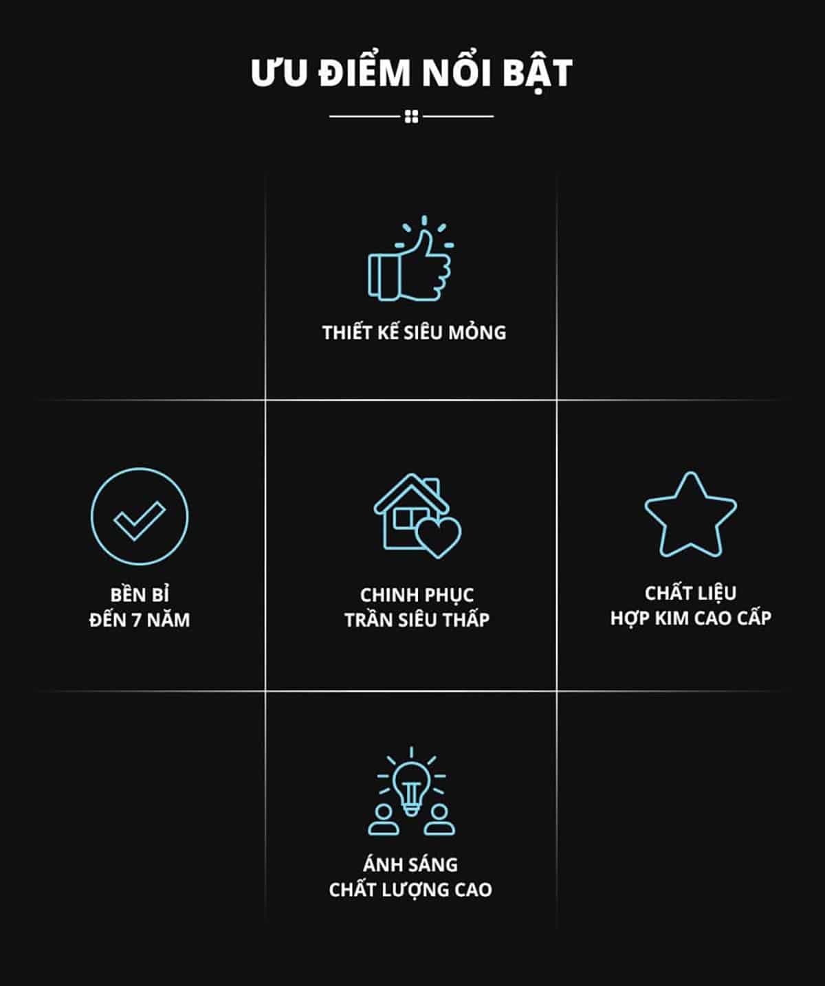 | Chất liệu | Nhôm (Thân đèn), Nhựa (Mặt đèn) |