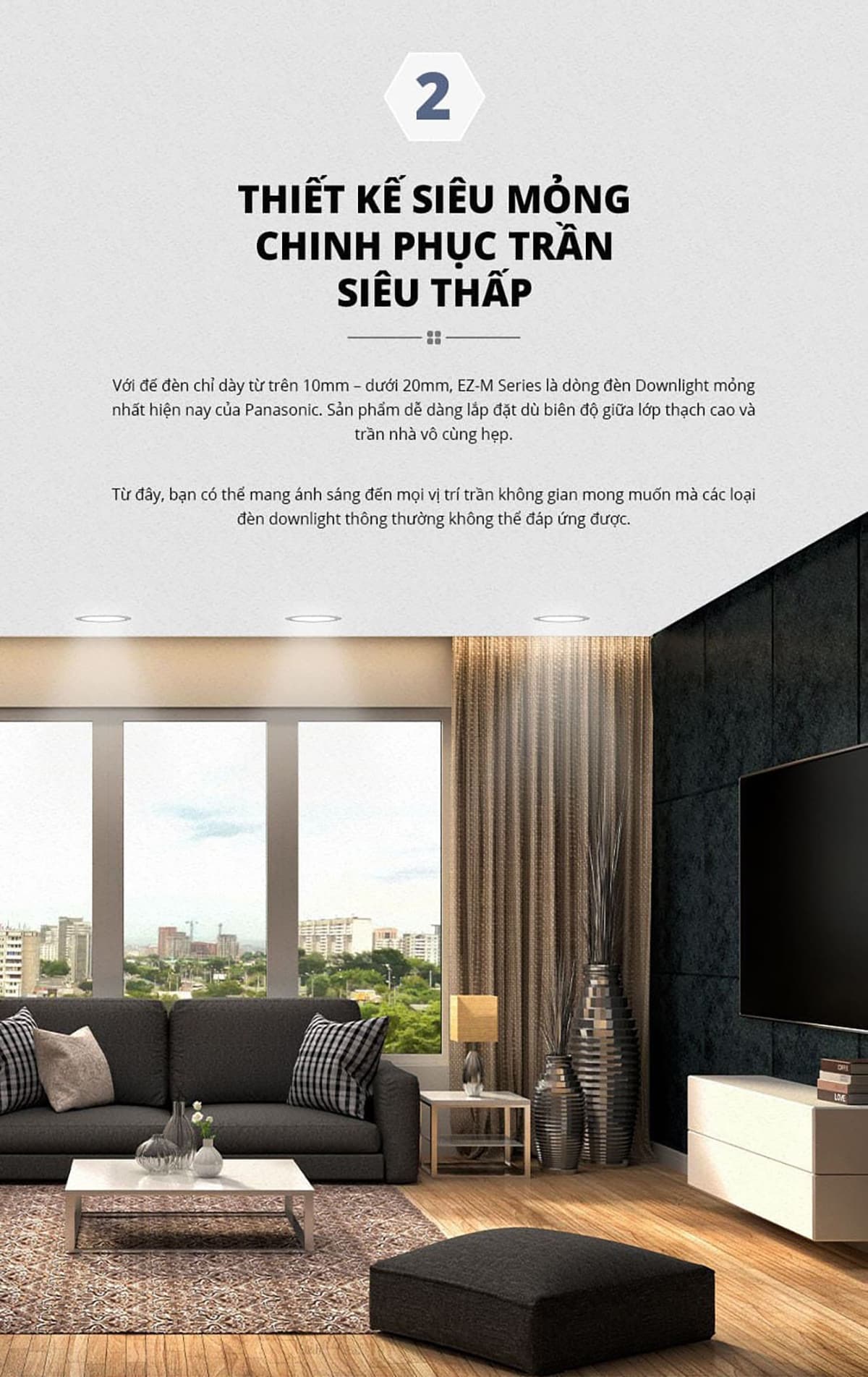 - Đèn LED âm trần Panasonic EZ-M Series đơn sắc có thiết kế nhỏ gọn thông minh, phù hợp cấu trúc trần nhà thạch cao, kiểu dáng sang trọng, tinh tế và bắt mắt.
