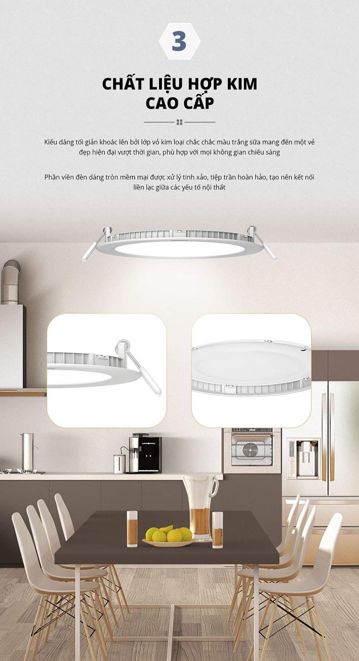 - Bộ nguồn tích hợp dễ lắp đặt, chỉ số hoàn màu lên đến Ra80, tạo ra ánh sáng gần giống với ánh sáng tự nhiên, không gây khó chịu đến mắt người sử dụng.