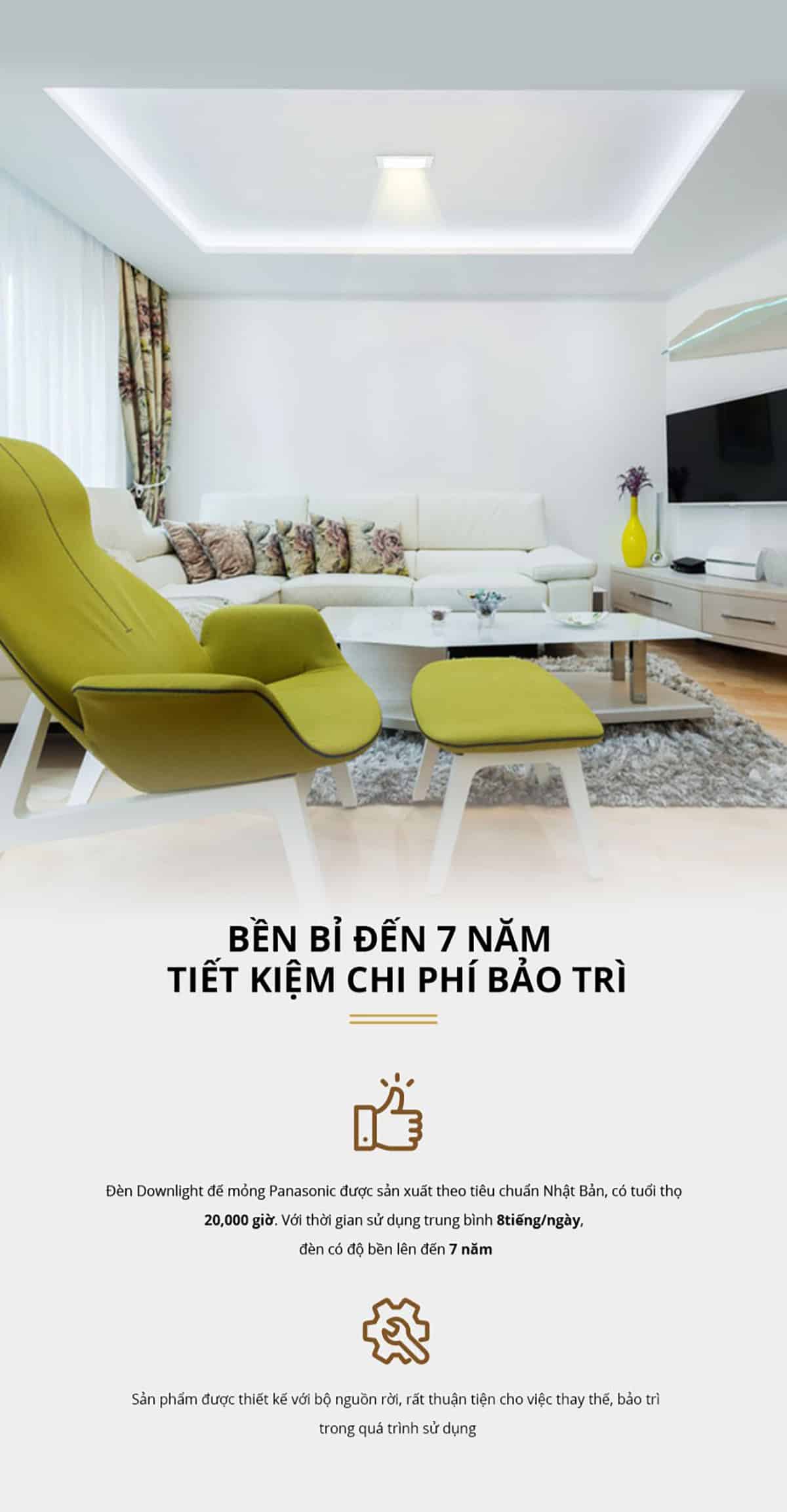 Đèn LED âm trần Panasonic Neo Slim đơn sắc tròn có thời gian sử dụng là 20.000 giờ duy trì chiếu sáng với công suất hoạt động 6W, 9W, 12W, 15W và 18W. Việc chọn sản phẩm có chất lượng cao, hoạt động ổn định và thời gian chiếu sáng lâu dài sẽ đem đến lợi ích chiếu sáng cao về kinh tế và bảo vệ toàn diện hoạt động sử dụng điện.