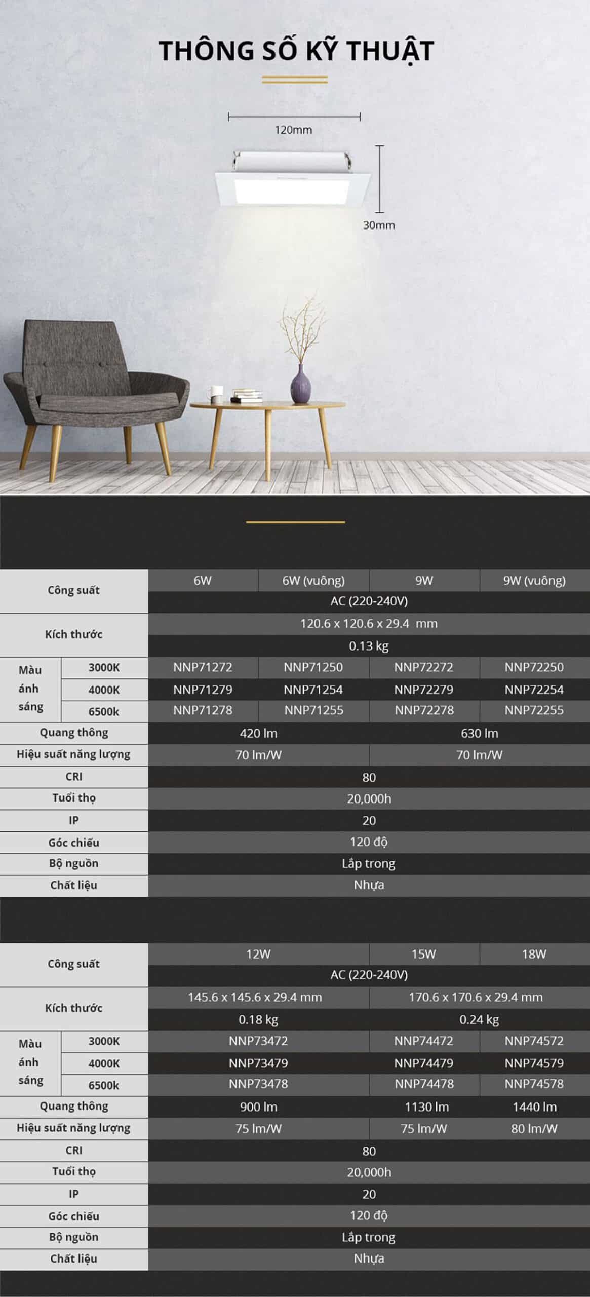 | Công suất | 6W, 9W, 12W, 15W, 18W |