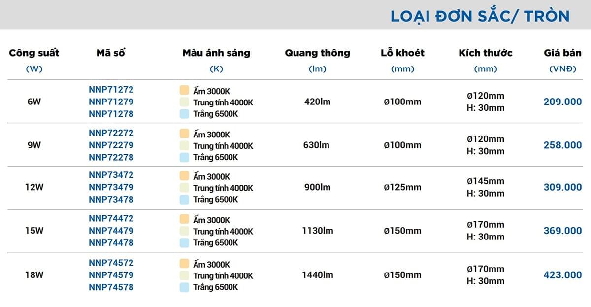 | Mã sản phẩm | Công suất | Màu ánh sáng | Quang thông | Lỗ khoét |