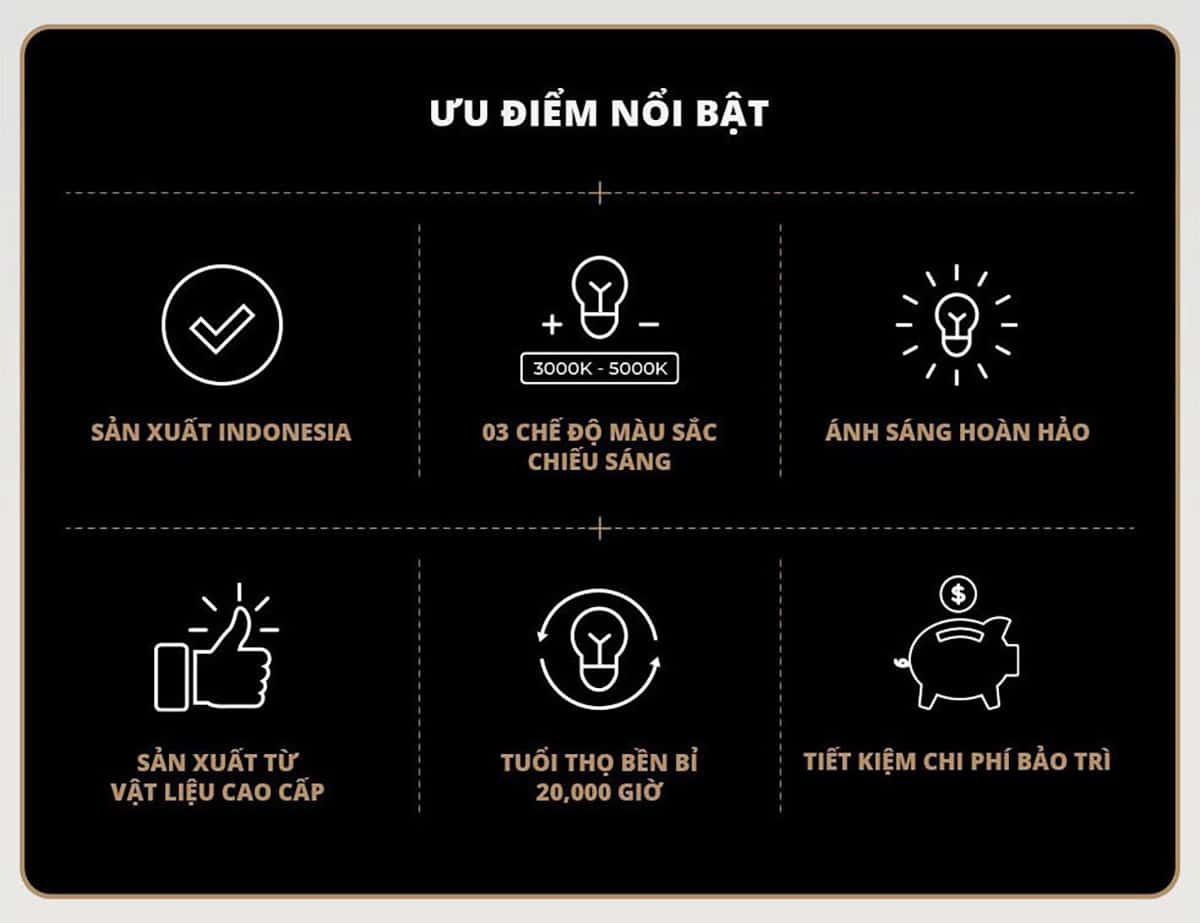 • Hoạt động với công suất chỉ 12W nhưng lại cho lưu lượng ánh sáng lớn và duy trì ổn định chất lượng sáng, có 3 màu ánh sáng đổi màu theo từng lần bật công tắc : ánh sáng vàng nhiệt độ màu 3000K, trung tính 4000K và màu trắng với nhiệt độ màu 6500K