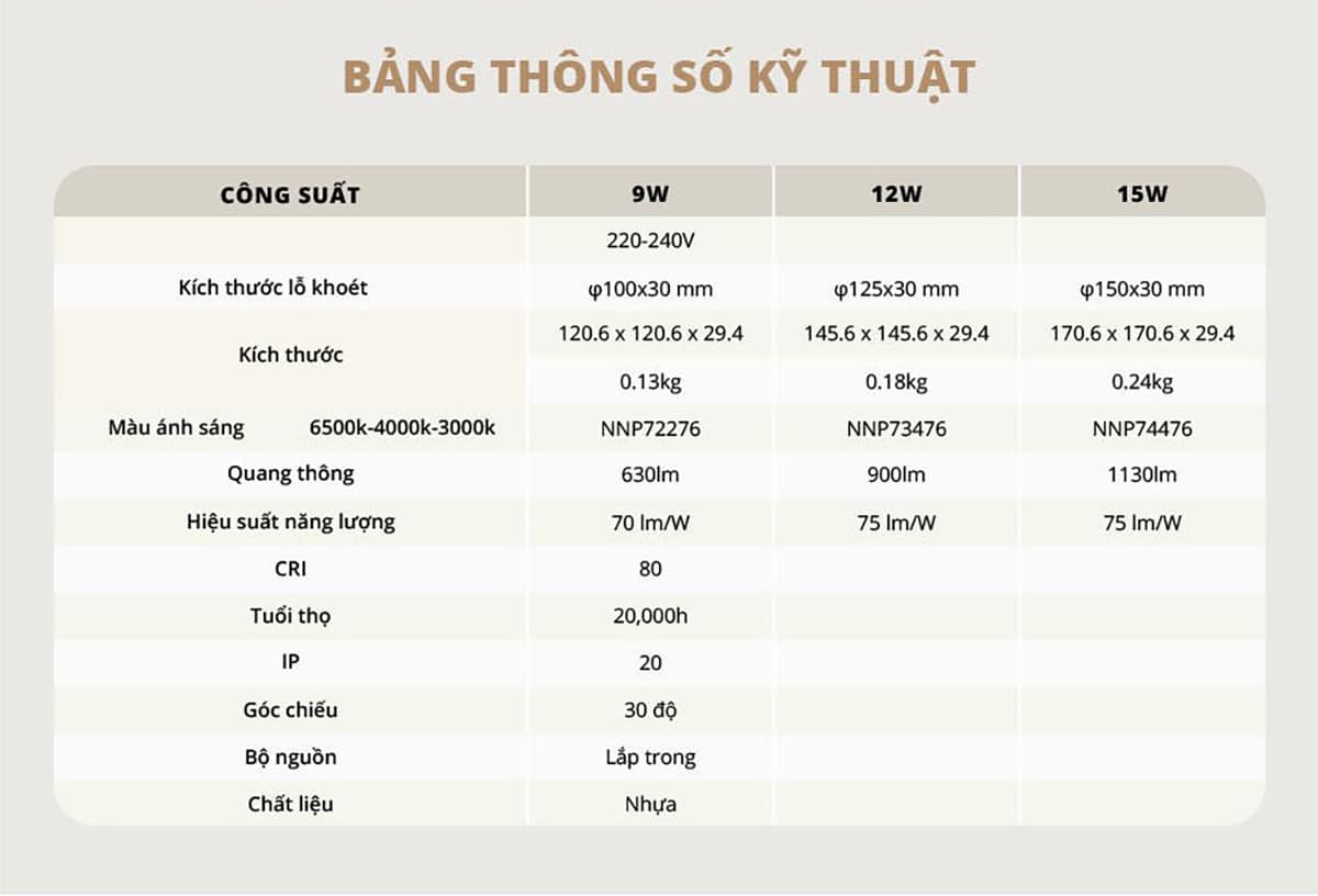 • Quang thông ở mức cao lần lượt là 630lm (9W), 900lm (12W) và 1130lm (15W)