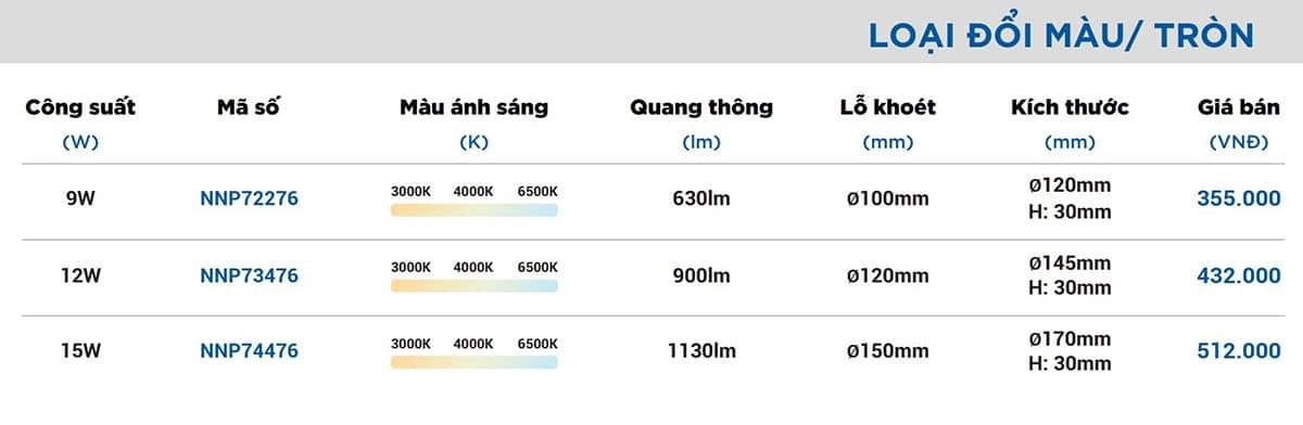 Thông số kỹ thuật của Đèn LED âm trần Panasonic Neo Slim đổi 3 màu | 9W (NNP72276), 12W (NNP73476), 15W (NNP74476)