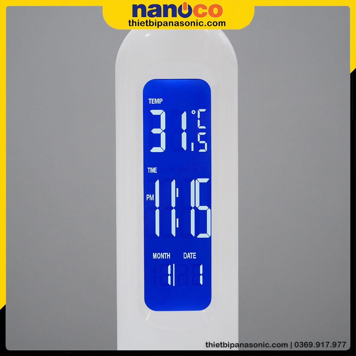 Đèn bàn Nanoco NDKR478 được tích hợp màn hình hiển thị giờ, nhiệt độ, độ ẩm giúp người dùng dễ dàng theo dõi giờ giấc