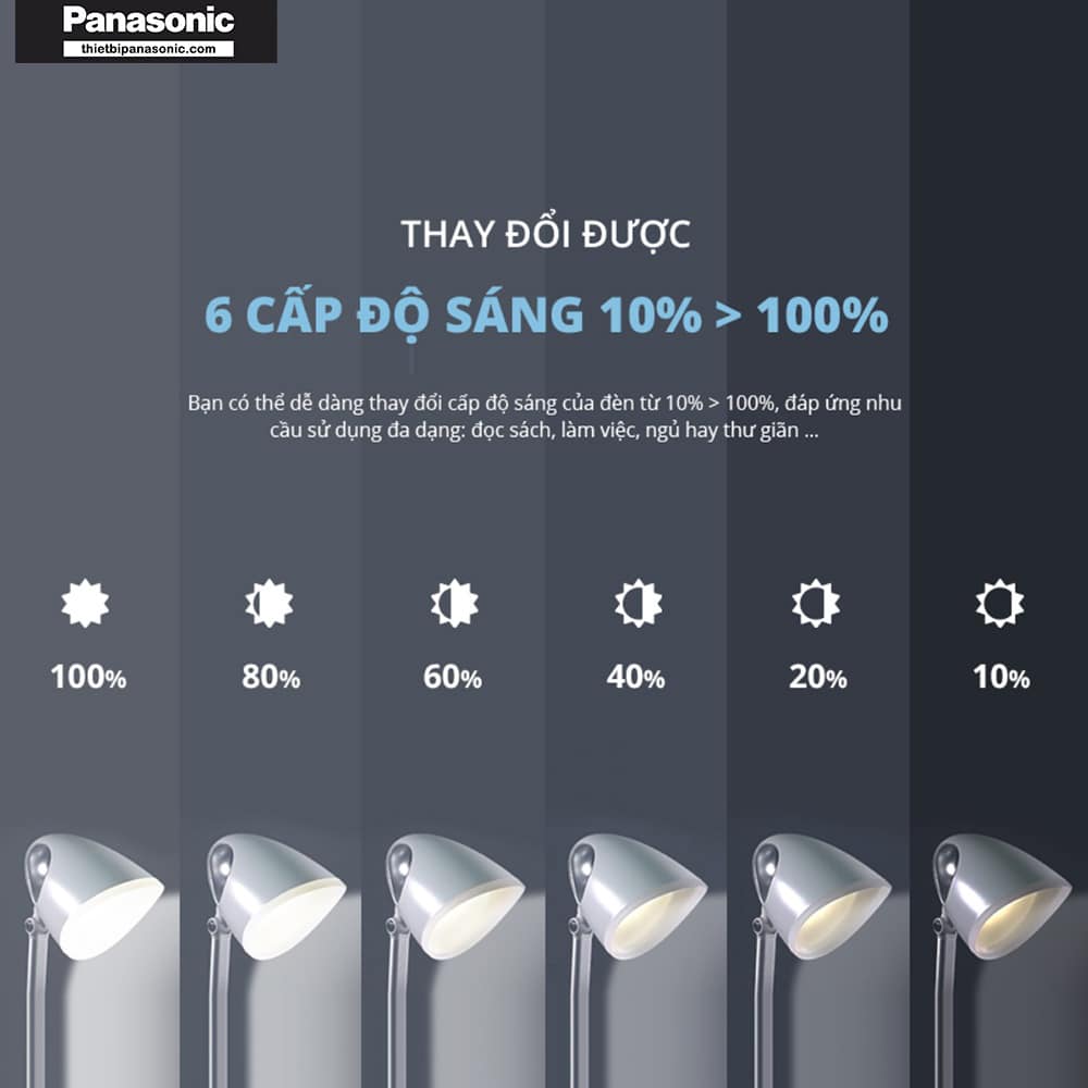 Đèn bàn LED Panasonic HH-LT062019 có thể thay đổi được 6 cấp độ ánh sáng từ 10% tới 100% đáp ứng đa dạng các nhu cầu như đọc sách, làm việc, ngủ hoặc thư giãn,...