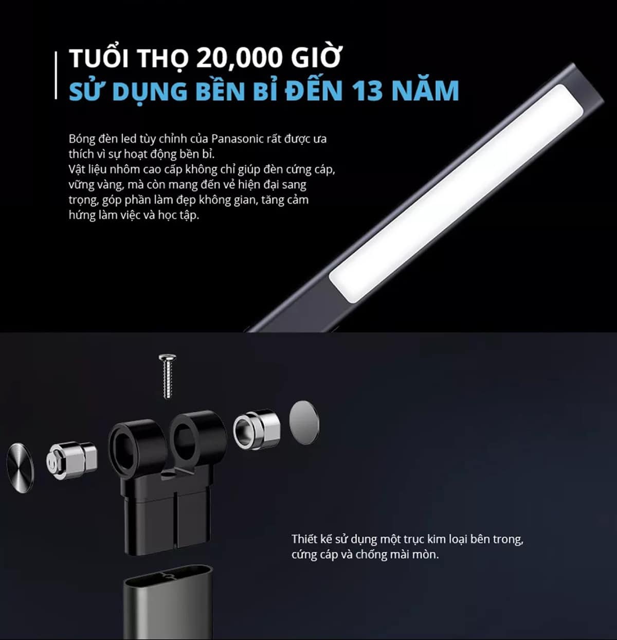 Điểm đặc biệt của đèn bàn Panasonic HHGLT042088 có tuổi thọ vô cùng lâu dài, lên đến 20.000 giờ chiếu sáng liên tục tương đương với 13 năm.