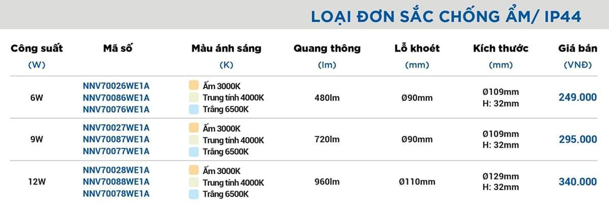 Đèn âm trần chống ẩm Panasonic có 3 sông suất khác nhau là 6W, 9W và 12W; cùng với mỗi mức công suất lại có 3 biến thể màu ánh sáng khác nhau giúp người sử dụng dễ dàng chọn lựa sản phẩm phù hợp với nhu cầu của mình.