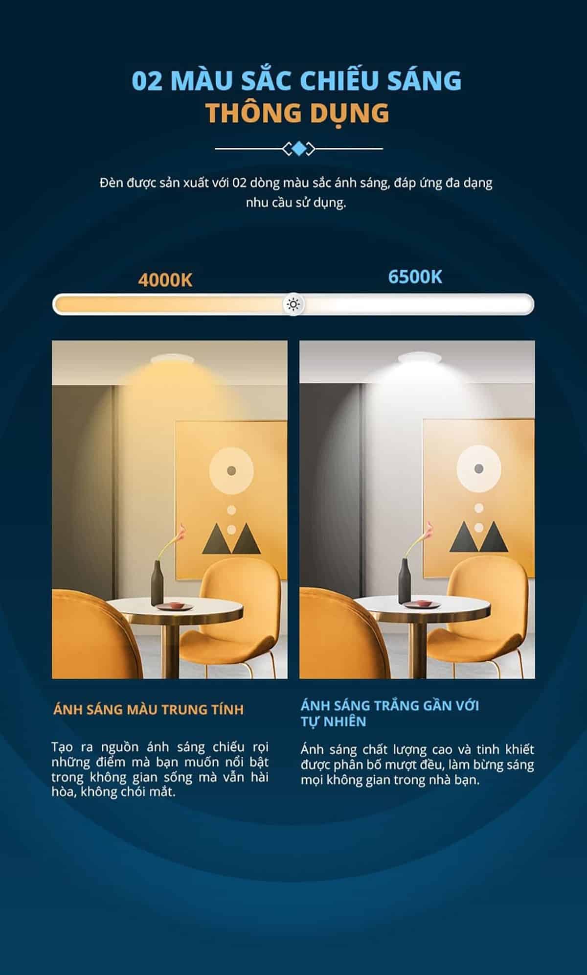 | Màu ánh sáng | Ánh sáng trắng, Ánh sáng trung tính, Ánh sáng vàng |