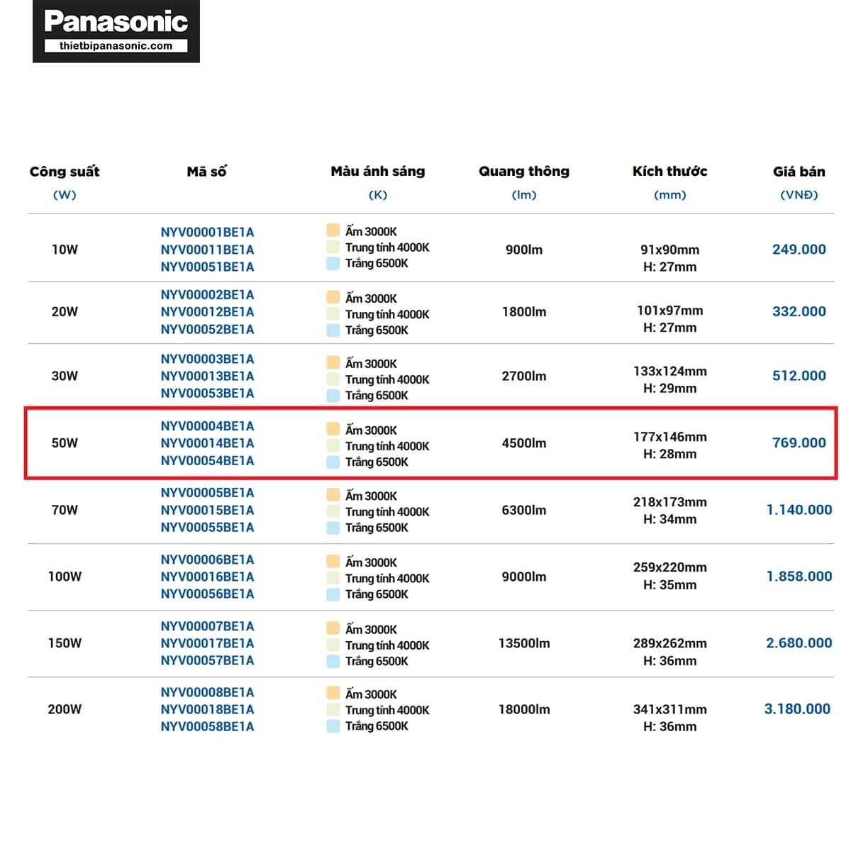 Thông số kỹ thuật của Đèn LED pha 50W Panasonic NYV00004BE1A (ánh sáng vàng), NYV00014BE1A (ánh sáng trung tính), NYV00054BE1A (ánh sáng trắng)