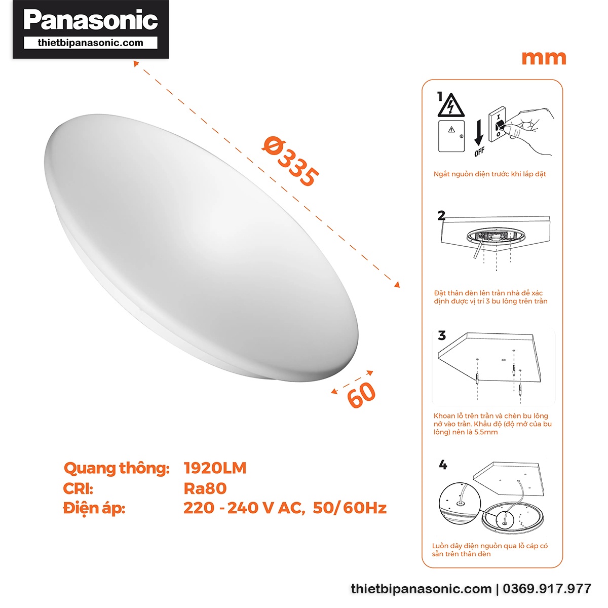 Về mặt thiết kế, đèn sở hữu kích thước Ø335mm với độ dày chỉ 60mm, mang đến sự thanh thoát và dễ dàng lắp đặt trên mọi loại trần. Vật liệu cao cấp như nhựa PC cho phần thân và acrylic trắng sữa cho phần chụp không chỉ tạo vẻ đẹp hiện đại mà còn giúp ánh sáng lan tỏa đều khắp không gian. Với góc chiếu rộng 120°, đèn đảm bảo không để lại vùng tối, tạo sự thoải mái cho người dùng.