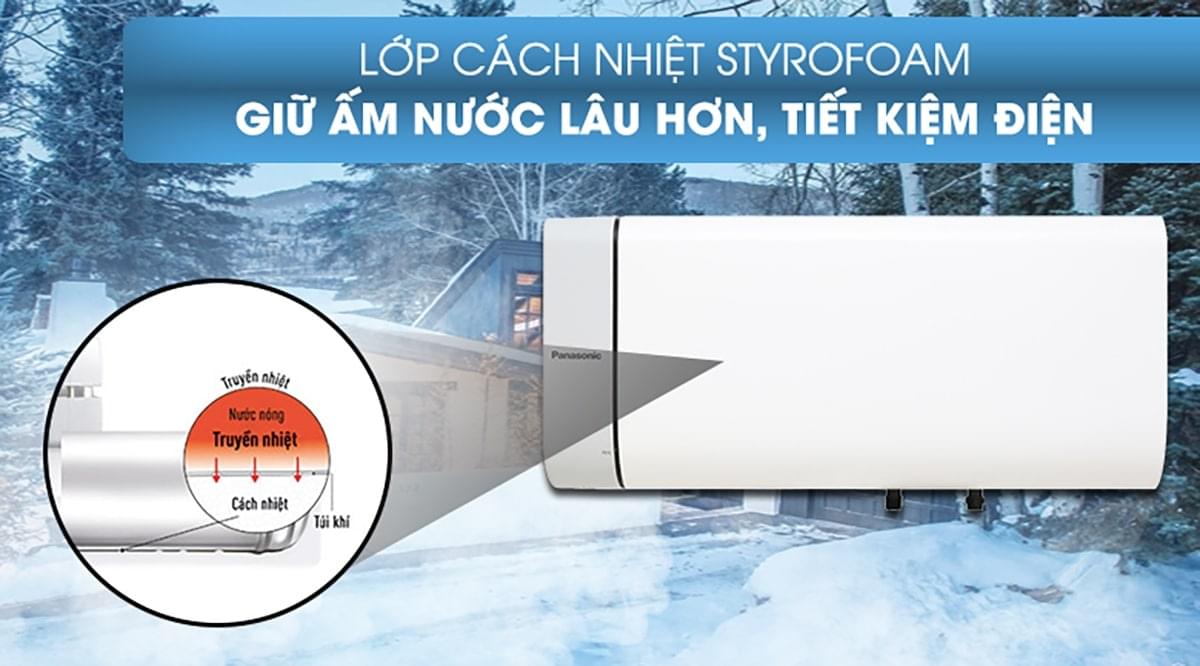Tấm cách nhiệt Styrofoam giúp giảm thiểu nhiệt năng bị thất thoát – công nghệ cách nhiệt của Panasonic được cấp bằng sáng chế tại Nhật Bản, đây là một trong những ưu điểm nổi bật khiến nhiều người ưa chuộng sử dụng bình nước nóng gián tiếp Panasonic 30L.