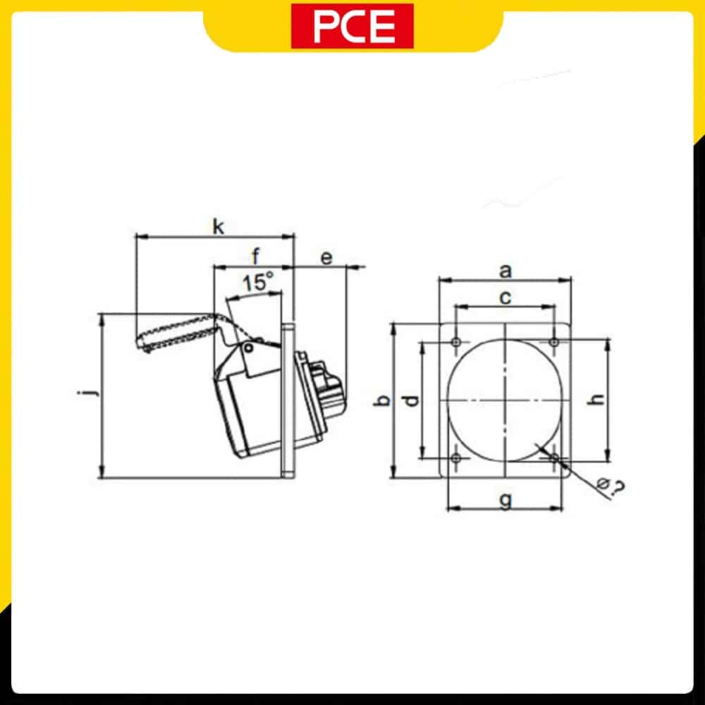 F414-6 – Ổ cắm gắn âm PCE dạng nghiêng 4P 16A 400V 6H IP44