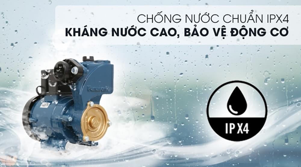 Máy bơm Panasonic 200W có khả năng kháng nước IPX4 giúp bảo vệ động cơ an toàn từ mọi hướng