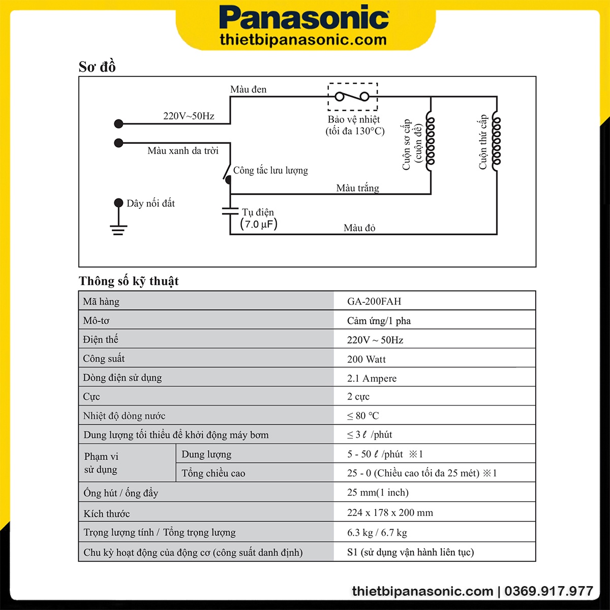 Sơ đồ đấu day và thông số kỹ thuật của máy bơm tăng áp nước nóng Panasonic GA-200FAH