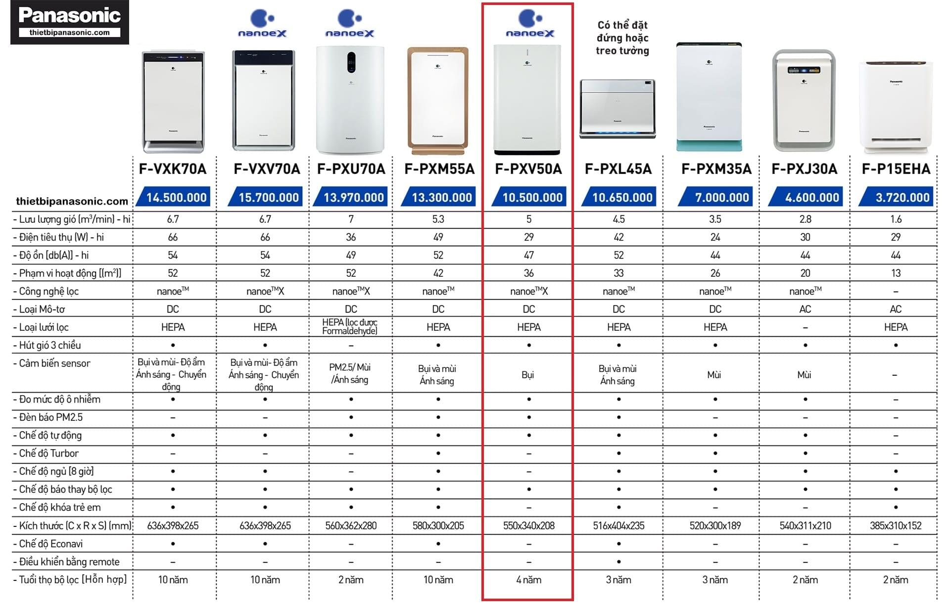 So sánh Máy lọc không khí Panasonic F-PXV50A với các loại máy lọc không khí khác của Panasonic