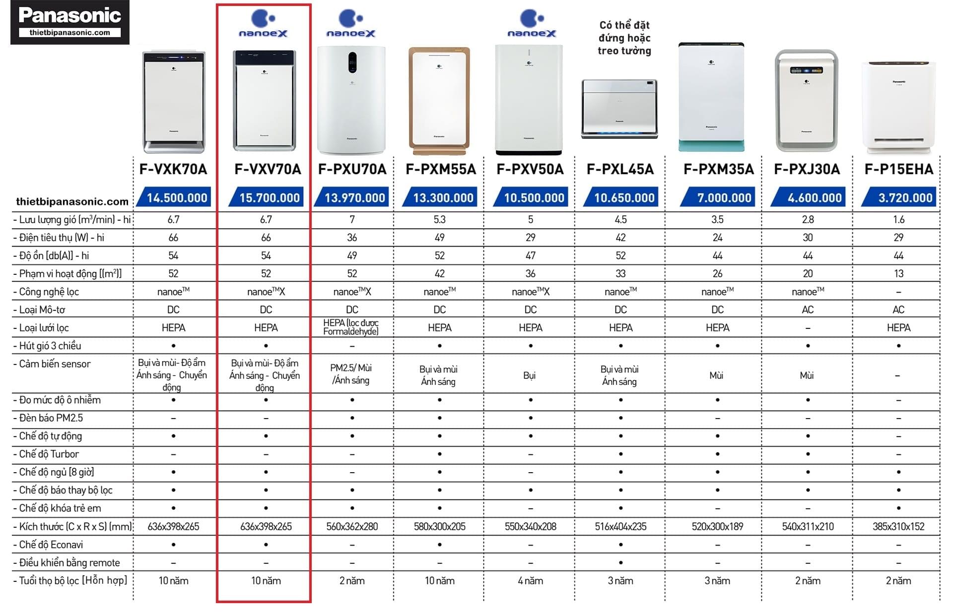 So sánh Máy lọc không khí Panasonic F-VXV70A với các loại máy lọc không khí khác của Panasonic