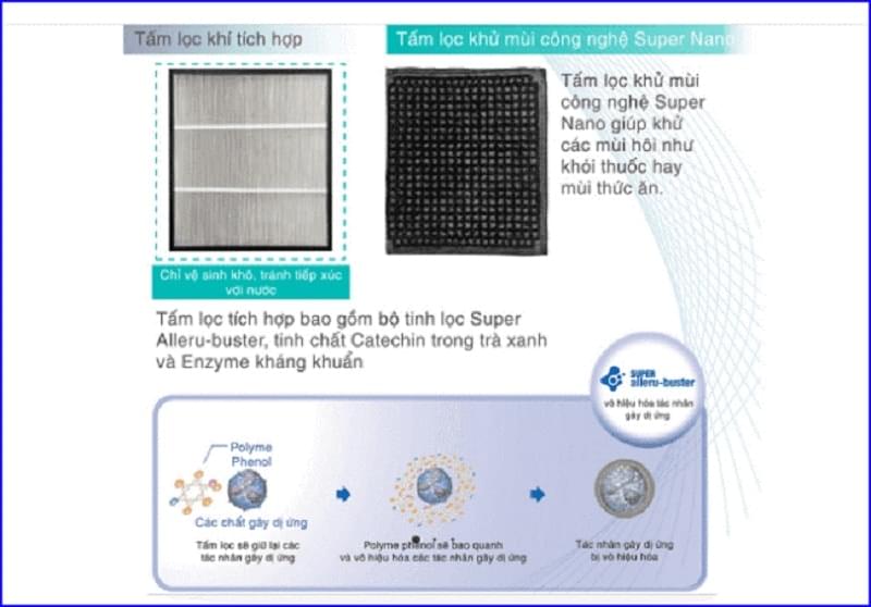 Màng lọc 2 trong 1 HEPA và khử mùi tích hợp 3 bộ tinh lọc Super alleru-buster, tinh chất catechin trong trà xanh và Enzyme kháng khuẩn, có khả năng loại bỏ đến 99% bụi mịn có kích thước PM0.003 (nhỏ hơn bụi PM2.5 khoảng 800 lần). Máy cũng ức chế vi rút, vi khuẩn và 17 loại chất gây dị ứng, mang đến không gian trong lành và an toàn cho bạn và gia đình.