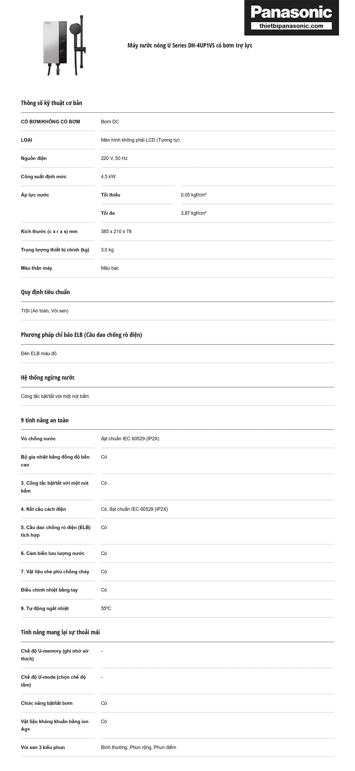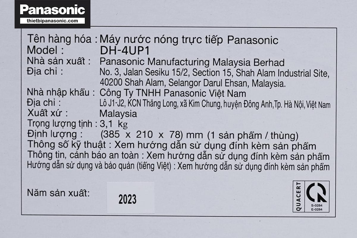Thông số kỹ thuật của Máy nước nóng Panasonic DH-4UP1VS