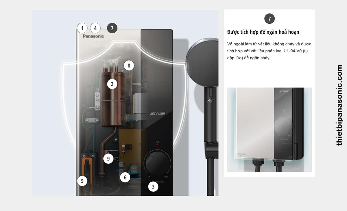 Tính năng an toàn số 7 trên Máy nước nóng Panasonic DH-4UP1VS là được tích hợp để ngăn hỏa hoạn nhờ vật liệu chống cháy