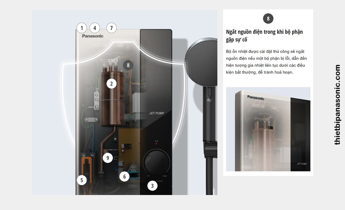Tính năng an toàn số 8 trên Máy nước nóng Panasonic DH-4UP1VS là ngắt nguồn điện trong khi bộ phần gặp sự cố nhờ bộ ổn định nhiệt được tích hợp