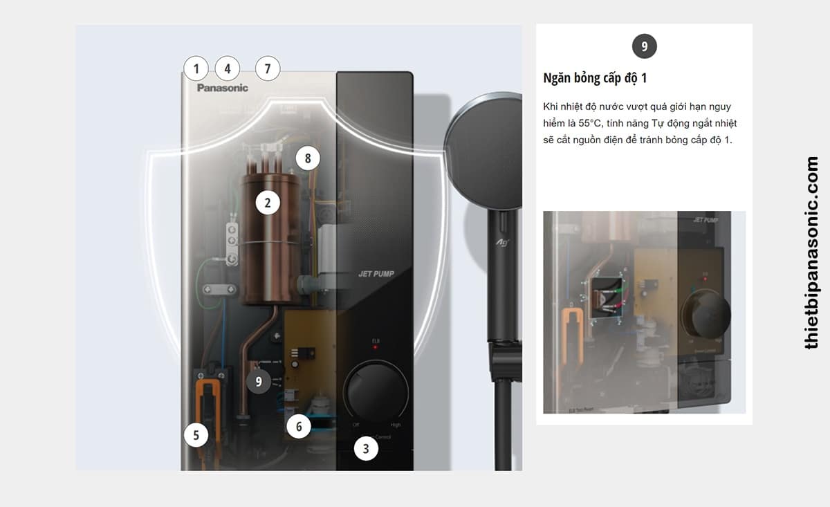 Tính năng an toàn số 9 trên Máy nước nóng Panasonic DH-4UP1VS là ngăn bỏng khi nhiệt độ nước vượt quá giới hạn nguy hiểm là 55 độ C