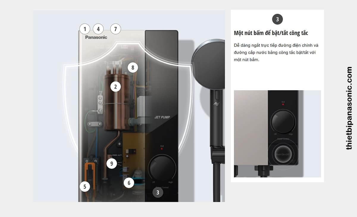 Tính năng an toàn số 3 trên Máy nước nóng Panasonic DH-4UP1VS là Một nút bấm để bật/tắt công tắc