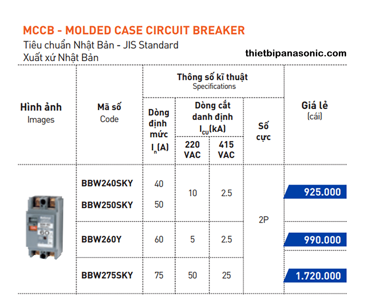 Bảng giá MCCB 1 pha Panasonic