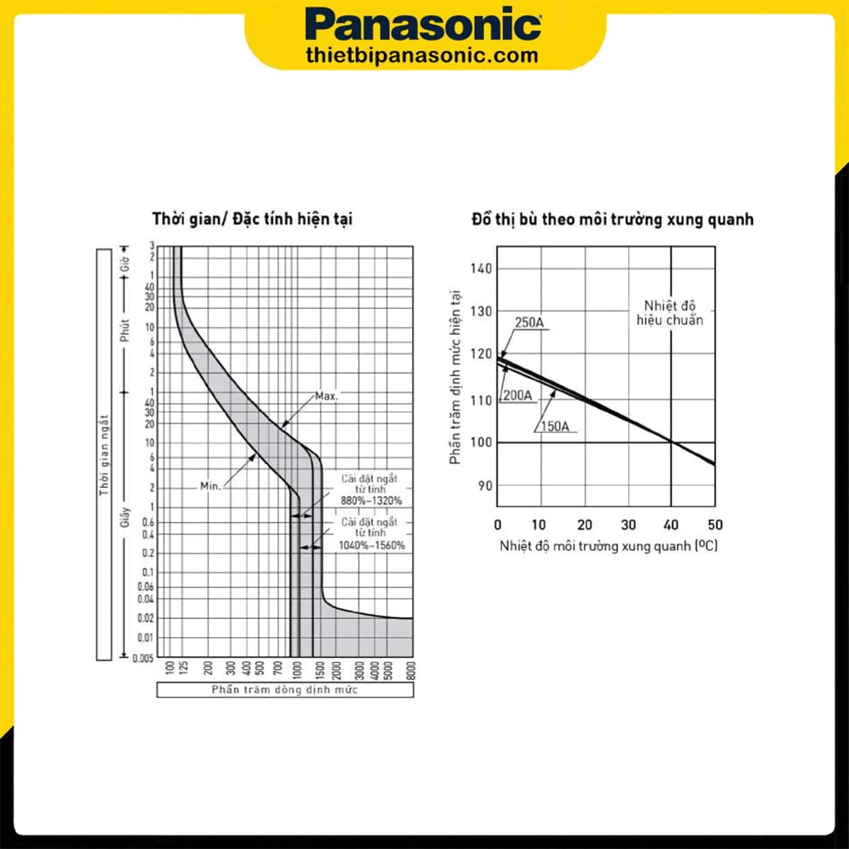 Đường cong đặc tính vận hành và đường cân bù nhiệt độ của MCCB 250A 3P Panasonic BBC3250YHV