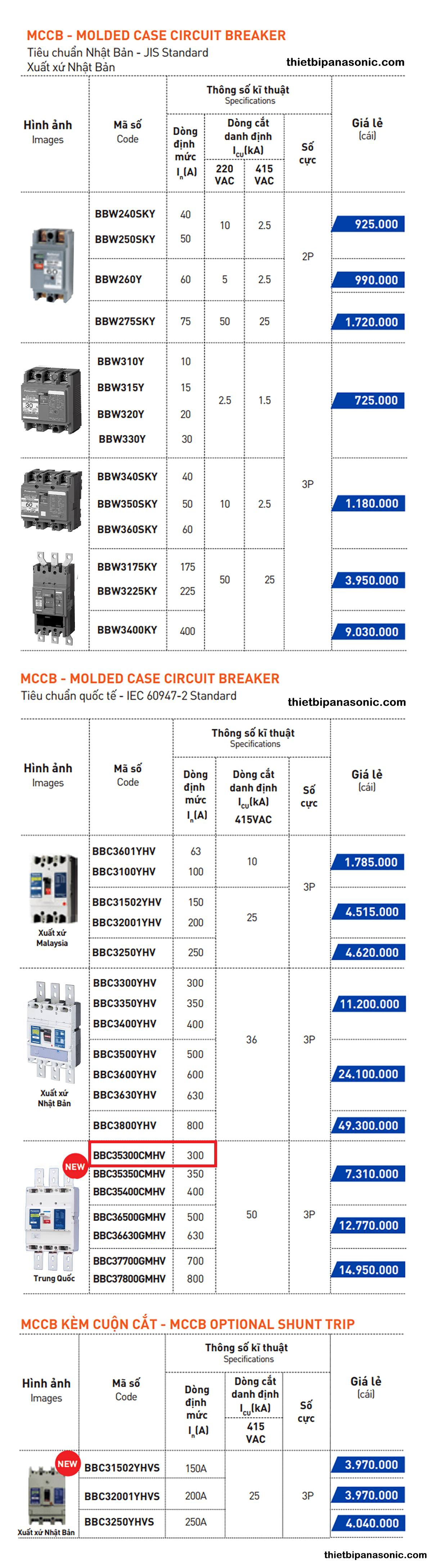 Bảng giá Bảng giá CB Panasonic, Bảng giá Panasonic, Giá MCCB