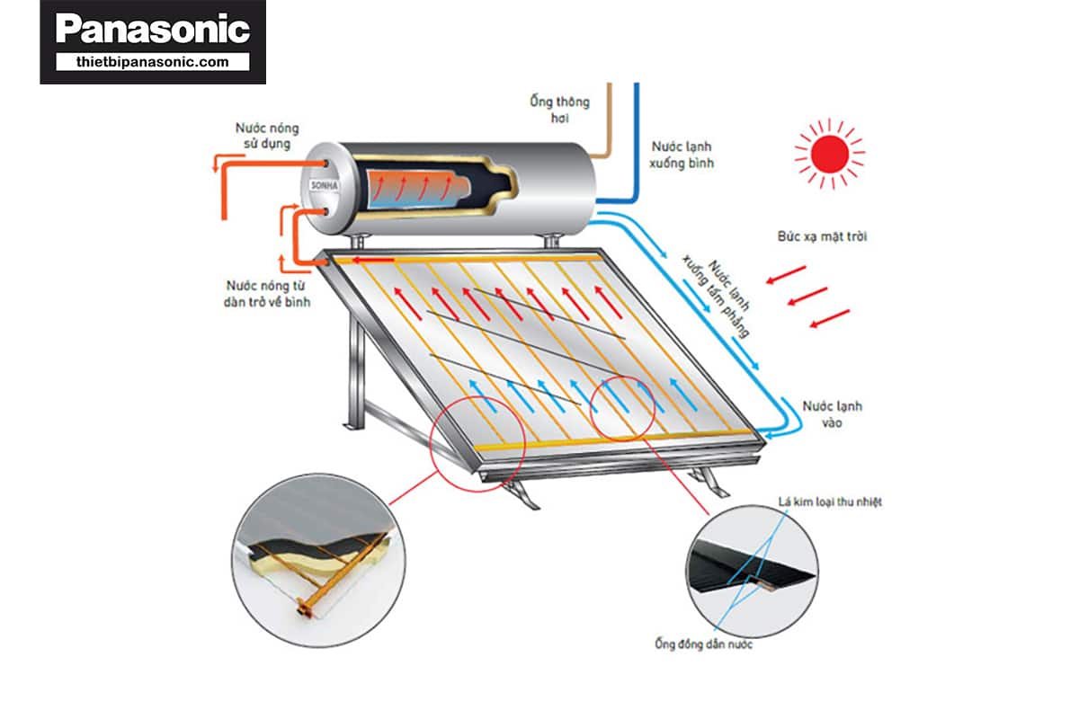 Khi nước chảy vào các ống chân không của máy tắm nước nóng năng lượng mặt trời, các chất liệu hấp thụ nhiệt bên mặt ngoài của ống thủy tinh sẽ tiếp xúc với ánh nắng mặt trời, làm cho ống thủy tinh nóng lên và truyền nhiệt độ cho nước bên trong ống. Qua đó, nước trong ống sẽ được làm nóng và lưu trữ trong bình chứa.