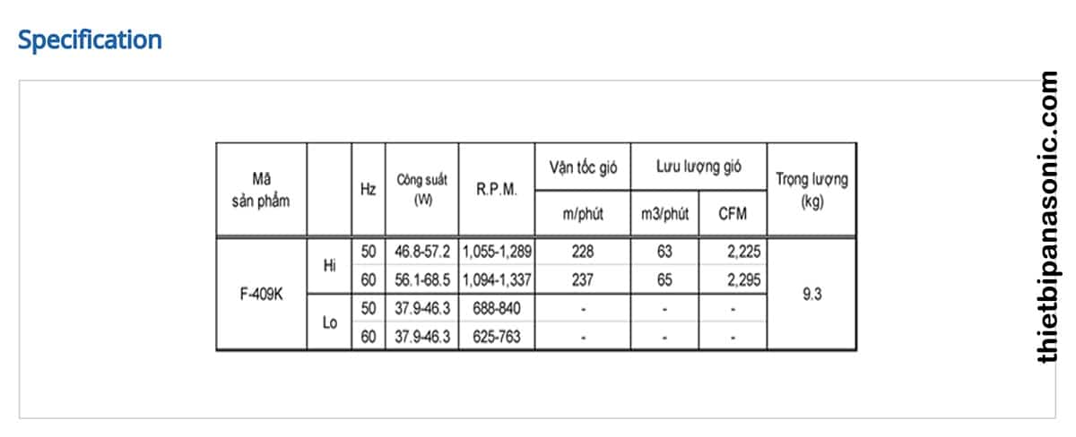 Bảng thông số kỹ thuật của Quạt đứng Panasonic F-409KBE từ nhà sản xuất