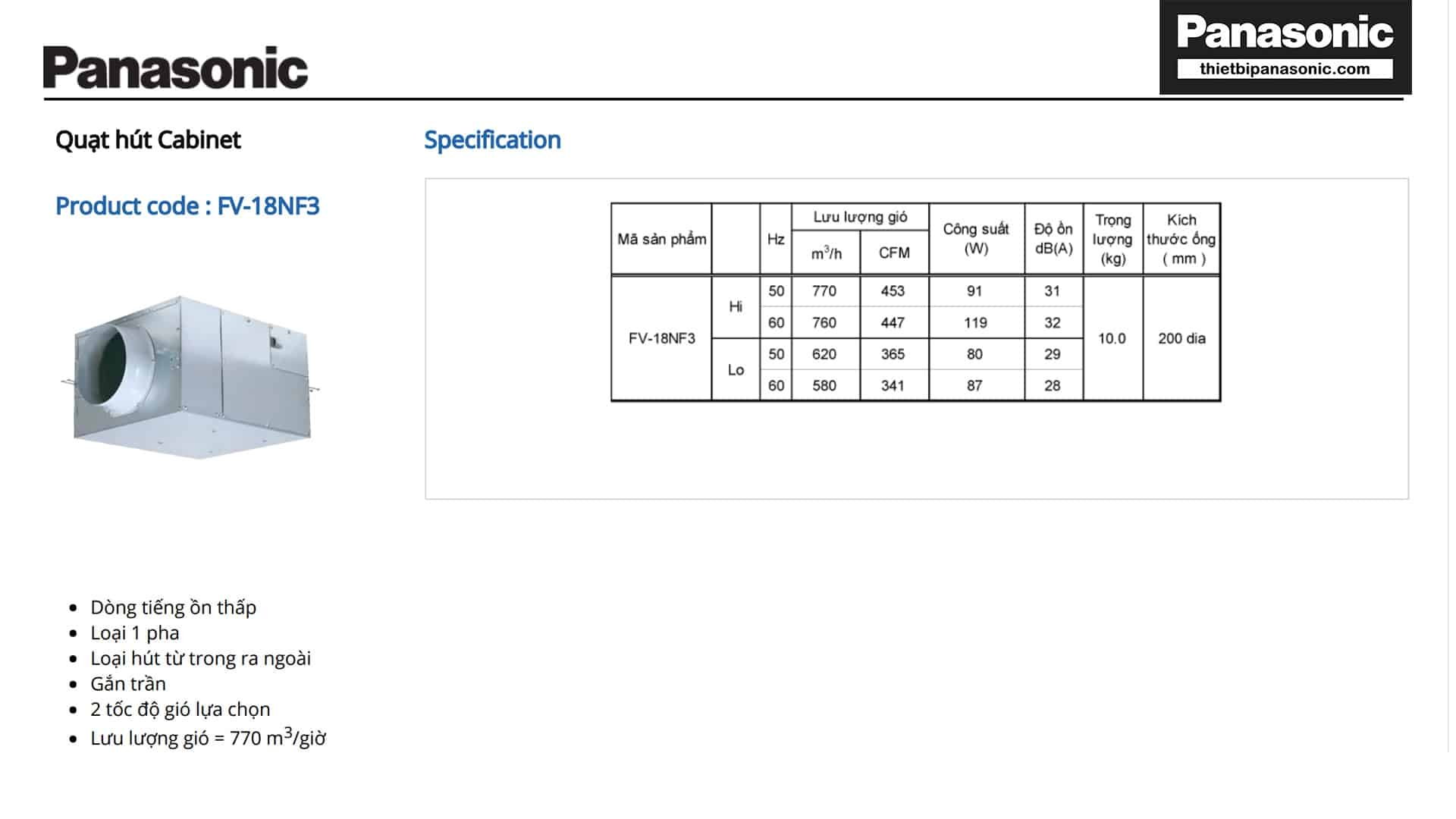 Thông số kỹ thuật của Quạt thông gió Cabinet Panasonic FV-18NF3