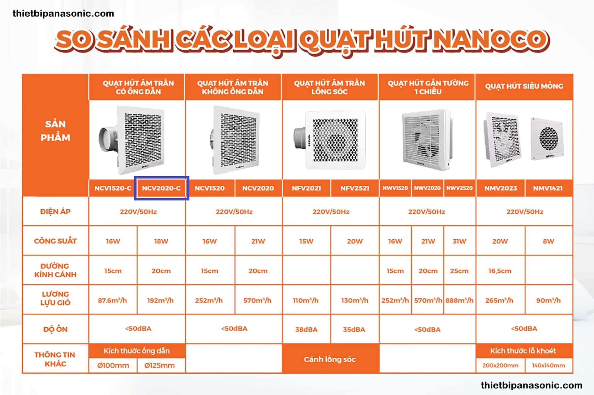 So sánh Quạt hút NCV2020-C với các loại quạt hút Nanoco khác